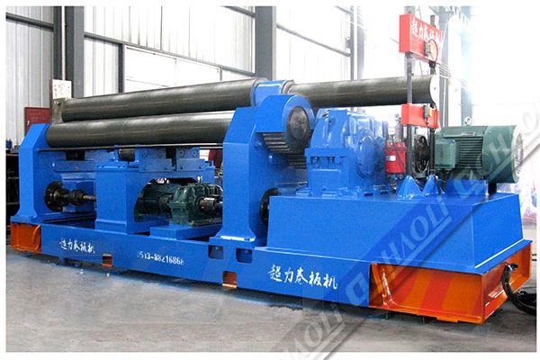 本機結構型式為三輥對稱式,上輥在兩下輥中央對稱位置作垂直升降運動,通過絲桿絲母蝸桿傳動而獲得,兩下輥作旋轉運動,通過 減速機的輸出齒輪與下輥齒嚙合,為卷制板材提供扭矩。本機床的缺陷是需借助其它設備實現預彎。本設備可卷板厚1mm-40mm,板寬8000mm的板料。